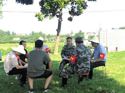 图为7月23日,赤壁市纪委副书记、监委副主任王为君与防汛抢险队员一起,在赤壁市四邑公堤防汛指挥部13号哨所研判汛情,部署安排下一阶段防汛抢险工作。