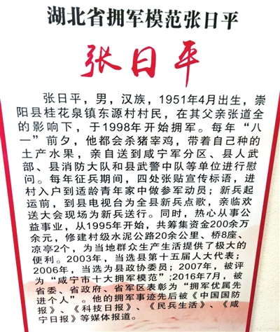 每年“八一”前夕,张日平都会杀猪宰鸡,带着自己种的土特产、水果,亲自送到咸宁军分区、县人武部、县消防大队和县武警中队等单位进行慰问。每年征兵期间,四处张贴宣传标语,进村入户到适龄青年家中做参军动员;新兵起运前,到县电视台为全县新兵点歌,亲临欢送大会现场为新兵送行。