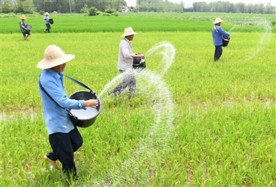 7月29日,嘉鱼县陆溪镇官洲村,村民为补种的中稻施肥。
