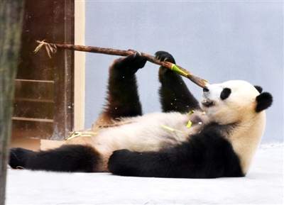 6月28日,湖南湘西,大熊猫“府府”在凤凰中华大熊猫苑室外馆悠闲地吃着竹子,憨态可掬,惹人喜爱。 (本报综合)