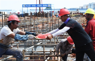 连日来,我市高温持续,市总工会和相关单位启动“送清凉进工地进企业”活动,为奋战在一线的工人们送去西瓜、矿泉水、毛巾等降暑物资以及慰问金,为高温下的劳动者带去一片清凉。