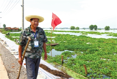 7月29日,嘉鱼县潘家湾镇东湖围堤,62岁的“老水利”游道书在察看堤岸,对内坡进行清沟沥水,保持堤坡干燥,防止散浸集中形成漏洞。