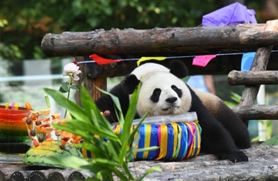 7月30日,吉林省东北虎园熊猫馆为大熊猫“初心”和“牧云”举行4周岁生日庆祝活动,饲养员精心准备了水果、竹子等丰盛美食,为“初心”“牧云”送上祝福。