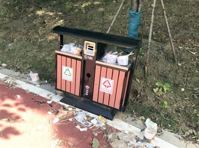 被“撑爆”的垃圾桶、散落的垃圾、难闻的气味,和公园精美的、怡人的景色格格不入。