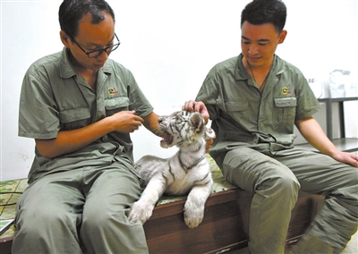 近日,在河北石家庄动物园,小白虎“妞妞”在饲养员张永宾与许家兴的细心照顾下健康成长。