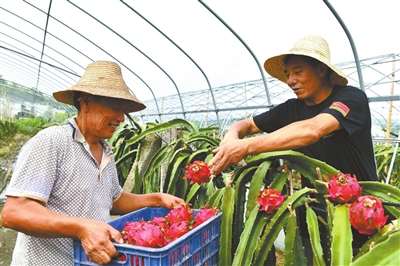 7月30日,通城县北港镇横冲村蔬果产业园,退伍军人李明才同村民采摘火龙果、葡萄,准备销往市场。