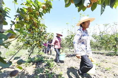 15日,位于嘉鱼县官桥镇阴山村的大禾现代农场,贫困户和村民正在采摘梨子。“每天工钱100元。”62岁的贫困户雷只英告诉笔者,她在广州打工8年,今年因疫情回来,每月3000元工资准时发放,得感谢湖北熙润田文旅开发有限公司让她实现了家门口就业。