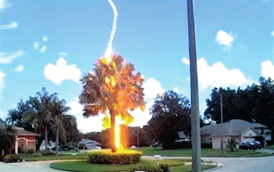 近日,美国佛罗里达州一名男子记录下了一个惊人的瞬间,晴朗的天空中一道闪电击中了一棵棕榈树。据悉,乔纳森·摩尔车内的记录仪拍下了这个瞬间,当时汽车距离被击中的树约22米。视频显示,当时晴空万里,没有暴风雨的迹象,突然一声巨响,一道闪电击中了这颗棕榈树。据报道,佛罗里达半岛中部是全美闪电最集中的地区。