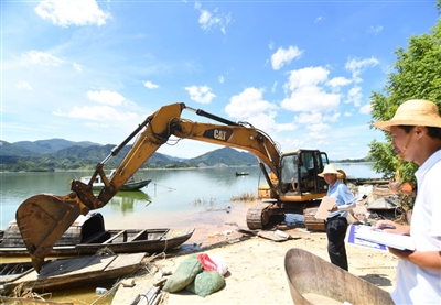 14日,通山县大畈镇长滩村富水湖畔,县镇村正在联合开展渔船拆解、登记。富水湖是长江中游南岸一级支流,为落实长江十年禁渔计划,通山富水湖沿线6个乡镇984艘持证捕捞渔船将分批进行拆解,目前全县已拆解渔船近700艘。