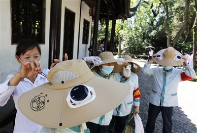 8月12日,江苏苏州拙政园为一线保洁员、保安人员新添了太阳能风扇帽,防暑降温送清凉,成为园内一道别样的风景。
