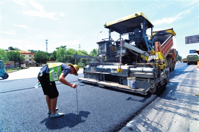 13日,在G351台小线嘉鱼潘家湾路口至花园海桥段,施工人员冒着高温铺沥青。