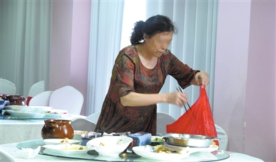 在城区某酒店,一场婚宴过后,记者发现不少前来就餐的顾客将未吃完的饭菜主动打包带走,杜绝浪费。