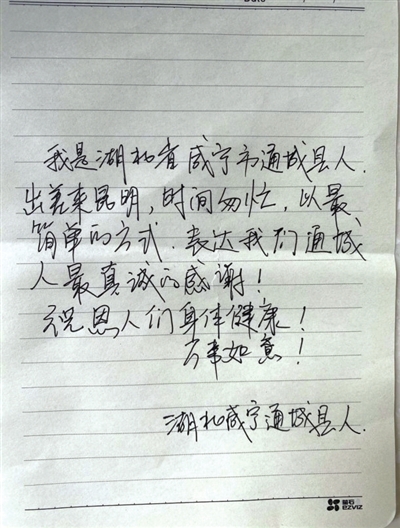 董黎说,袋子里装了一些桂圆和香蕉,还留下一张字迹工整的小纸条,上面写着:“我是湖北省咸宁市通城县人,出差来昆明,时间匆忙,以最简单的方式,表达我们通城人最真诚的感谢!祝恩人们身体健康!万事如意!”