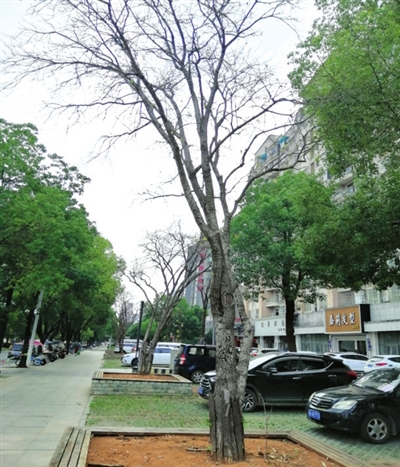 昨日上午,记者来到咸宁大道康城郦都路段,在生态停车场看到,多棵树木已经枯萎,树叶全部掉光,有的树皮已烂掉,树干出现空洞,树心呈黑色。这些光秃秃、毫无生气的树木孤零零地站立着,与咸宁大道两侧青翠挺拔的行道树形成鲜明对比,与繁华街景格格不入。