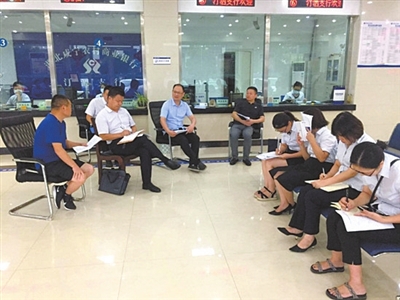 会前,各参会人员对汀泗支行行容行貌、看板管理、员工工作日志和网点柜面服务情况等进行了观摩点评。