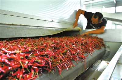 时下,湖北省恩施土家族苗族自治州宣恩县农民种植的辣椒进入采收、烤制高峰期,合作社开足马力烤制辣椒供应市场。辣椒种植是当地在推进精准扶贫的过程中普遍推广的富民产业。