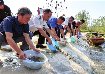 当天共增放鲢、鳙、草鱼,鲤鱼类3000万尾,均为3一5公分规格的幼苗,使用增殖放流项目资金60万元。