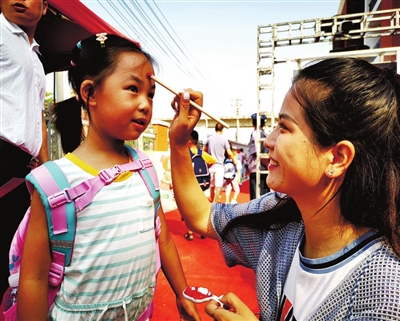 早早等候在校门口的老师,在陆续到达的孩子们额间轻点朱砂,意为开启智慧,目明心亮,希望学生日后能好读书、读好书,学习一点就通。
