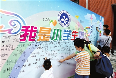 走进校园,新生们首先领到入学纪念书签。沿着红毯,一路设置了入学誓词、入学证明、“我是小学生啦”签名墙等等。俏皮的语言、可爱的卡通、镂空的头像引得家长不断为孩子拍照留念。