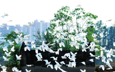 绿草茵茵,溪水潺潺,白鹭成群在此栖息觅食。9月3日,记者在大洲湖湿地生态区看到白鹭齐飞、绿水环绕的美景。