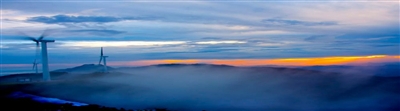 6:00 风车口日出是铜鼓包内一道美丽风景线。巨大的白色风车矗立在群山之间,伴着蓝天白云,形成一幅浪漫又唯美的画面。风车口是内陆地区首座风电场,在这青翠山峦上聆听风的声音,也是难得的体验。远眺赣中,遥望华夏南天,赣北群山,犹似大海波涛,在你脚下奔腾起伏。