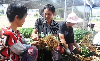 9月5日,咸安区汀泗桥镇洪口村熊家湾草莓基地,来自浙江台州玉环市的农民应启节在指导当地农户移栽草莓种苗。