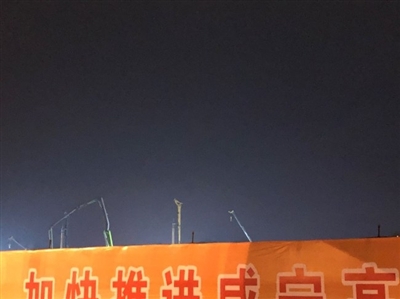 23日晚10点半,记者来到璟湖世纪城施工现场,透过围挡,记者看到工地里一片灯火通明,几名工人正在电焊施工,“噼噼啪啪”的声音不绝于耳。记者现场看到工地里有两辆挖掘车正在铲运渣土,发出响亮的轰鸣声。至记者离开,两辆挖掘车仍在工作。