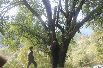 桂花源里,一棵200多年树龄的古桂树下,王振启看着古桂的身份牌,抚摸着古桂的枝干,随后拿出测量工具,对古桂的枝、干进行测量,他轻轻的将古桂树的东、南、西、北四处的枝、叶、花摘下一些,小心翼翼地放进书内夹好,并随笔记录下古桂的生长情况……2个多小时后,王振启完成了这颗古桂的数据采集工作。