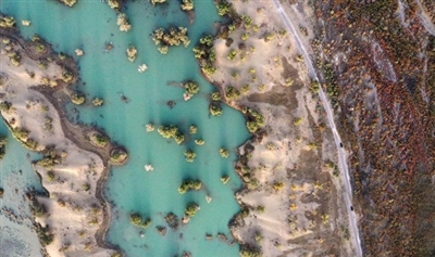 金秋时节的新疆塔里木河湿地,湖泊、胡杨、红柳、沙漠、鸟儿一道呈现五彩斑斓的景色,一片秋天美景如诗如画。