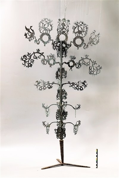 近日,一件出土于宝鸡南郊东汉时期的青铜摇钱树被成功修复。这件由人物、动物、铜钱等诸多元素组成的摇钱树造型精美、工艺复杂,见证了两千年前秦岭蜀道两端的文化交流。