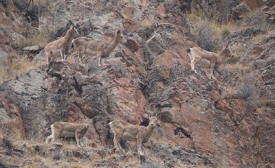发源于别珍套山莫逊达坂的鄂托克赛尔河,地处高海拔地区,是一片原始风光地带。正在没有人类的干扰,才给野生动物留足了生存空间,加之当地政府加强了野生动物的保持力度,野生动物数量不断增加,当天约有多群北山羊地此活动,最大群约有80多只,小群也有10多只。 (本报综合)