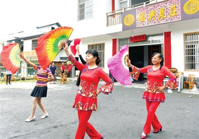 乡村美,村民乐。午后,村民潘玲霞和村里的姐妹排练起广场舞。