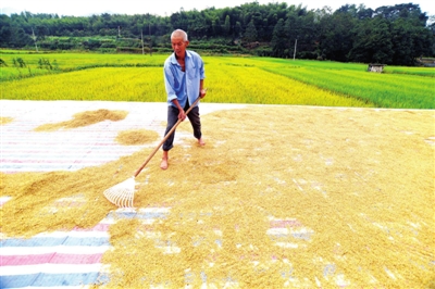 9月28日,崇阳县铜钟乡6组,村民趁天晴在家门口晾晒刚收割的稻谷。