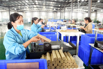 9月29日,嘉鱼经济开发区武昌首义学院环保健康产业园,嘉鱼华艾生物科技有限公司艾产品加工车间,工人娴熟地卷制艾棒。