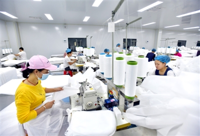 10月13日,咸安经济开发区湖北爱鑫医疗科技有限公司车间,工人们正在生产民用防护服。