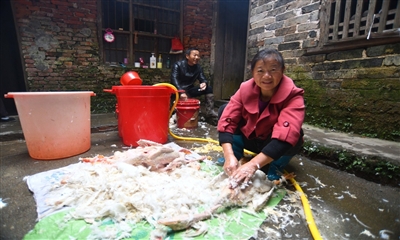 夫妻俩蹲在天井里,一个忙着除毛,一个忙着清理内脏,身旁刚烧沸的开水不停地冒着热气。宰鹅后留下的鹅毛,夫妻俩也小心翼翼地收起来……