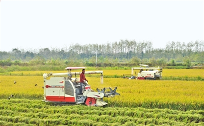 在车埠镇黄土村5组种粮大户刘小新家的水稻种植基地,两台收割机穿梭在稻田间,稻浪随之翻滚,沉甸甸的稻穗进入收割机后就变成了粒粒饱满的稻谷。