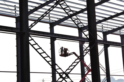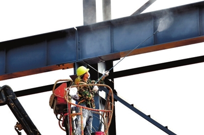 10月13日,咸安经济开发区旭腾基础工程有限公司,工人们正在给钢架厂房喷防锈漆。