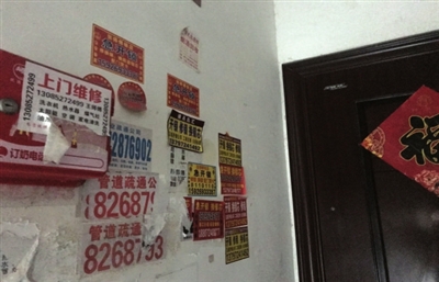 走进一栋居民楼,扑面而来的,就是密密麻麻的小广告,让人有眼花缭乱之感。
