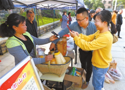 10月23日,大幕乡广场“扶贫日”消费活动火热开市,各类农副产品琳琅满目,农户争相展销着自家的农特产品,引起不少消费者驻足选购,“赶集”现场吆喝声、问询声不断,场面十分火爆。 通讯员 吴涛 杨天慧 摄
