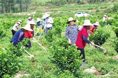 13日,通山县南林桥镇格宁农业园果汁桔基地,附近村民在除草、培肥。