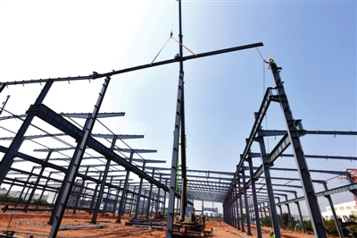 10月13日,咸安经济开发区华宁防腐科技产业园二期项目,工人们正在吊装钢架厂房。