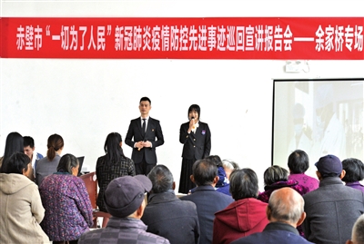 11月3日,赤壁市余家桥村党员群众服务中心活动大厅,80余位村民坐在长条凳上,认真倾听赤壁市百姓宣讲队成员讲述发生在身边的抗疫故事。