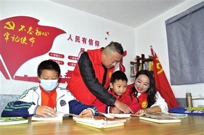 “我来帮你们检查语文和数学作业吧!”11月2日,蒲圻街道和尚岭社区龚家湾小区儿童校外课堂,小酒窝志愿服务队志愿者黄联勇正辅导孩子们完成作业。