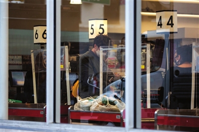 11月12日,在美国纽约一家超市,人们在装有防护罩的收银台前结账。美国疾病控制和预防中心12日公布的数据显示,全美11日报告新增新冠确诊病例143408例,新增死亡病例1479例。 据新华社