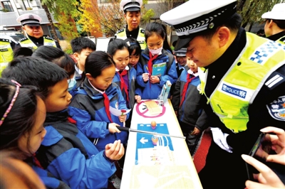11月20日,交警在西安市实验小学为学生讲解安全知识。