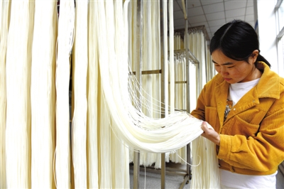 15日,在嘉鱼经济开发区湖北瑞滤膜科技有限公司生产车间,工人在查看一束束像面条一样的中空纤维过滤膜。
