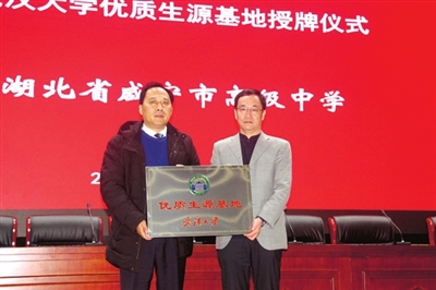 本报讯 记者汪俊东、通讯员陈蕾报道:11月27日,武汉大学本科生院副院长王福、教授刘正猷一行来咸宁高中调研讲学,并授予咸宁高中优质生源基地称号,举行授牌仪式。