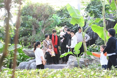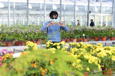 5日,在嘉鱼县官桥镇田野开心农场,游客在育苗馆里赏花。