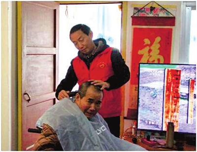 近期天气阴雨连绵,一些年老的居民不方便出门,李之胜和伙伴们穿上爱心红马甲, 和其他同事一起,为退役军人雷洛贵修剪头发。